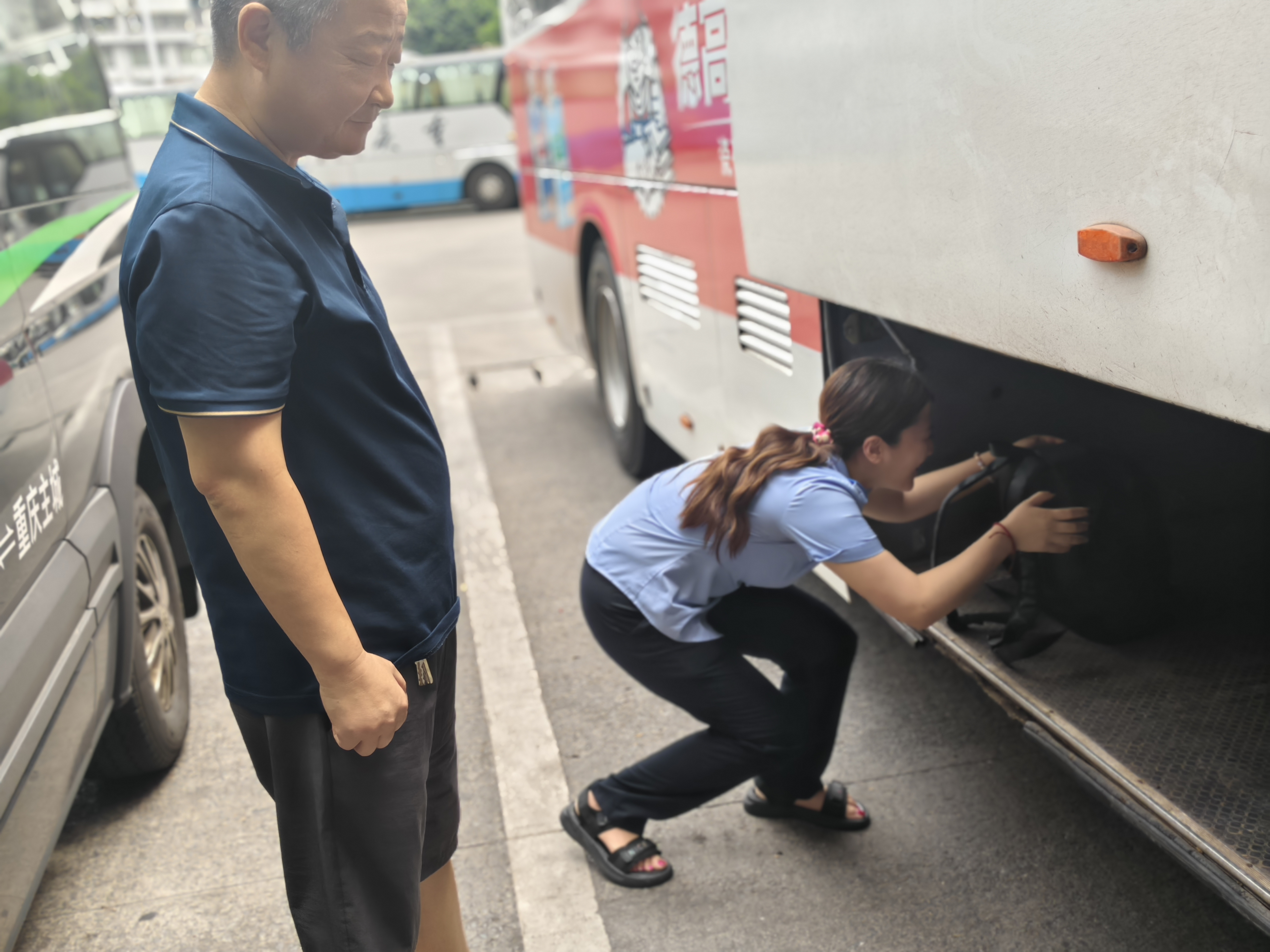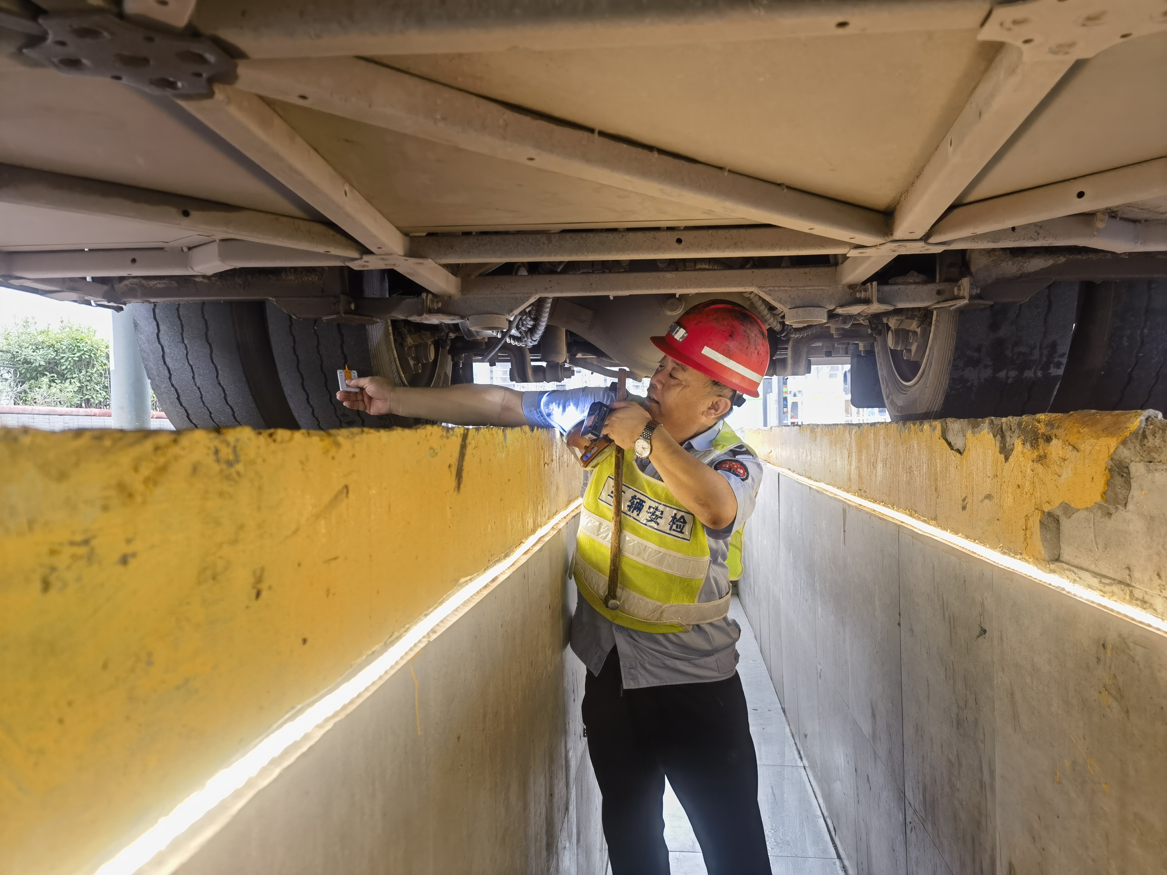 龙洲湾汽车站54岁的车辆例检工杨炯民正弓着腰,熟练地钻进温度高达50℃的闷热狭窄的车检地沟内,他一手拿着强光手电,一手拿着工具仔细检查车辆底部的每一个零部件,坚决不放过任何一个可能存在的安全隐患。汗水早已浸透了他蓝色的工装,但他毫不在意,全身心地投入到检查工作中,他用坚守与责任,为旅客的每一次出行拧紧“安全阀”。